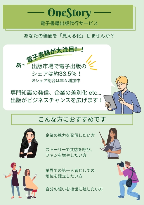 出版市場において電子書籍のシェアは年々増加しており、現在では約33.5%を占めています。 専門知識の発信、企業のブランディング、そして新たなビジネスチャンスの創出…。電子書籍出版は、あなたの可能性を大きく広げる力を持っています。